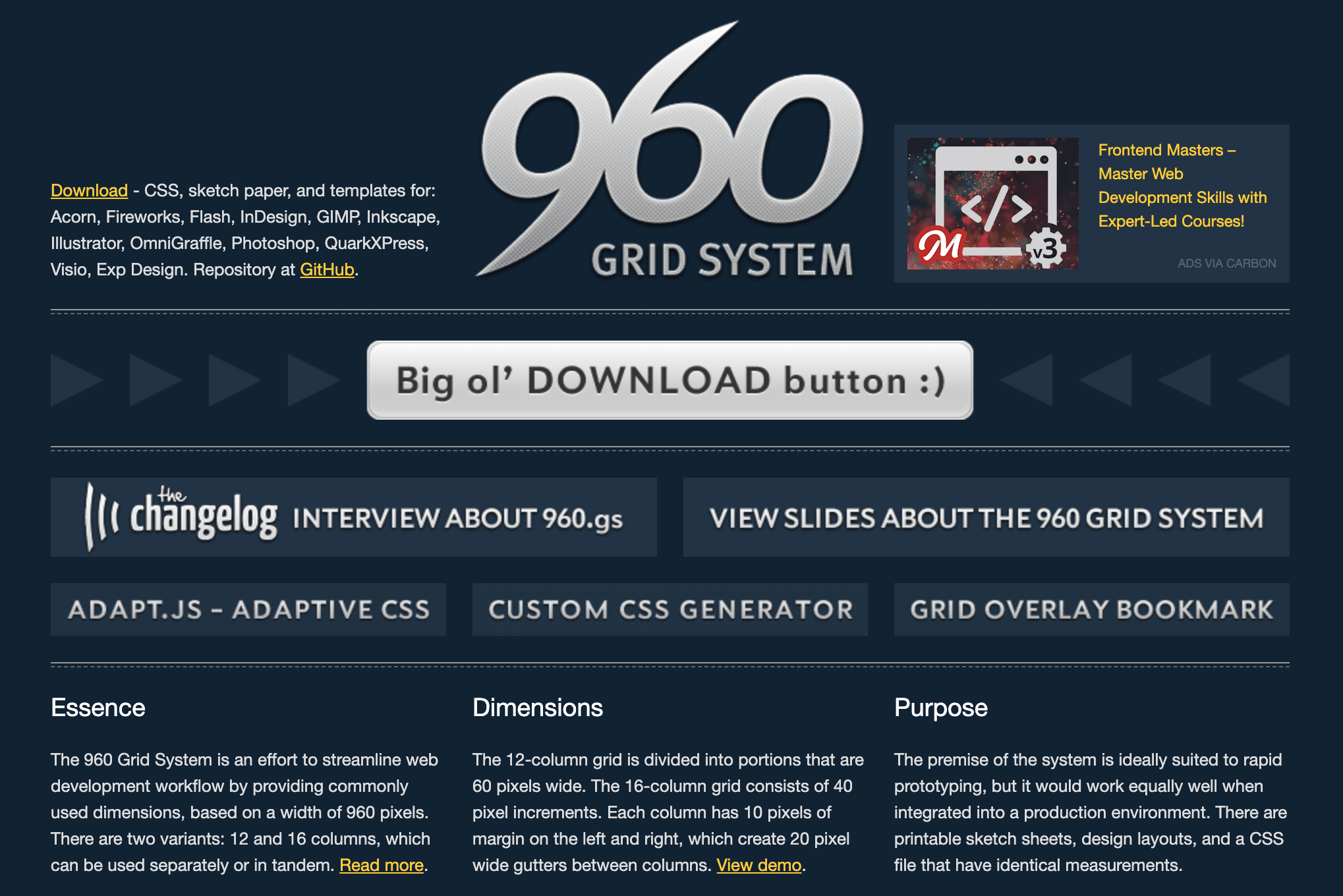 Soon after, we started to see the first CSS frameworks. One of the most popular was the 960 Grid System. It was based on a 960px-wide container divided into 12, 16, or 24 columns. You would add classes to your elements to specify how many columns they should span.